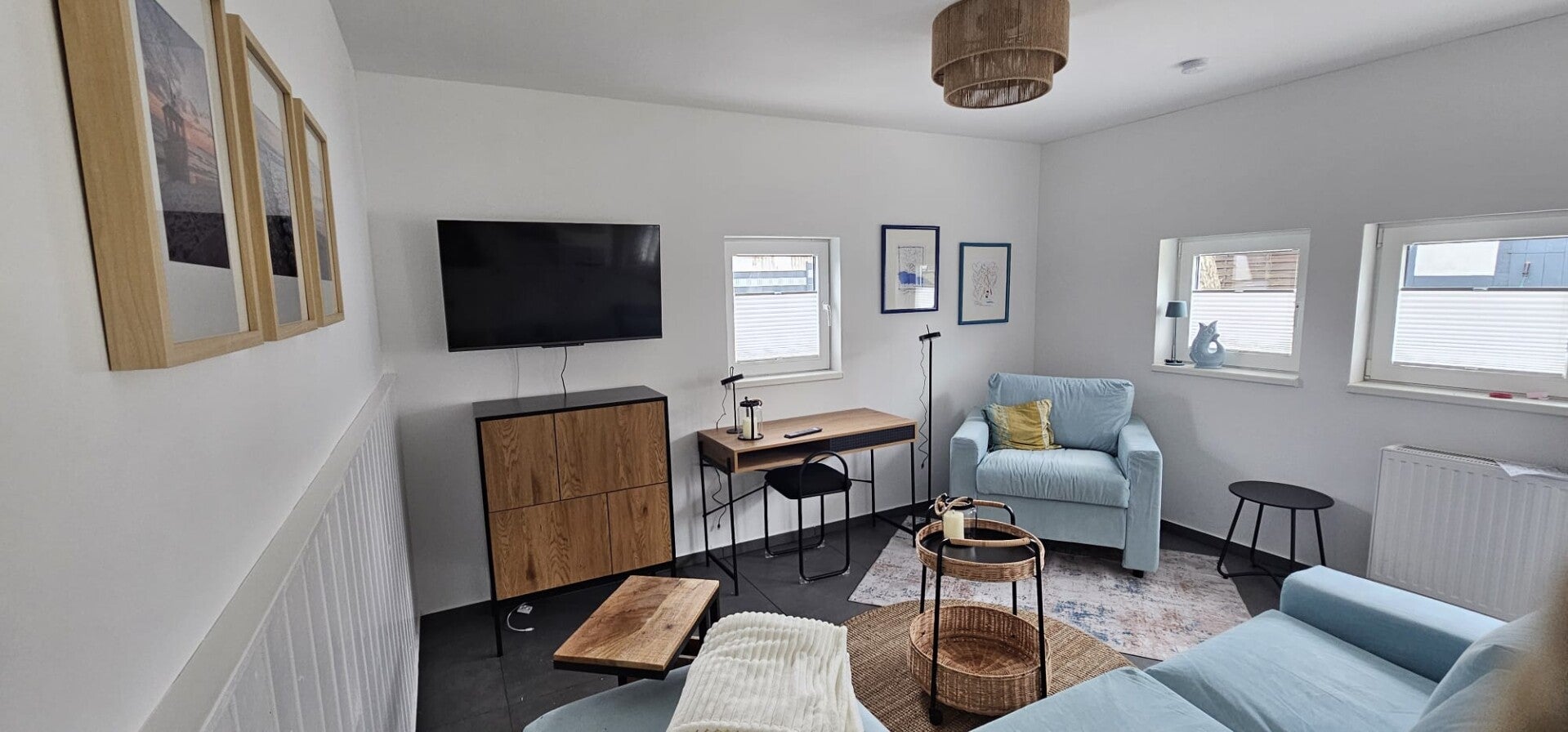 Hier erwartet Sie auf 50 qm Ihre moderne Ferienwohnung, Mitte 2025 fertig gestellt. Die geschmackvolle Einrichtung schenkt Entspannung, ob im Wohnraum mit TV und Sofalandschaft, im Schlafzimmer mit bequemem Doppelbett und Terrassenzugang oder auf der möblierten Terrasse, die in einen großen grünen Garten übergeht. Die bestens ausgestattete Küche mit Sitzgelegenheit ermöglicht eine eigene Versorgung wie auch der Elektrogrill auf der Terrasse. Der Hauswirtschaftsraum mit Waschmaschine bietet Platz für Koffer und Garderobe und das moderne barrierefreie Badezimmer mit großer Dusche ist durch die Gestaltung eine kleine Wellness-Oase.